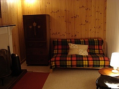 Salle de Lecture: Bois en pin et moquette, cheminée, fauteuils, canapé-lit .